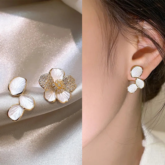 Brincos Assimétricos Folha Flor com Pétalas de Cristal