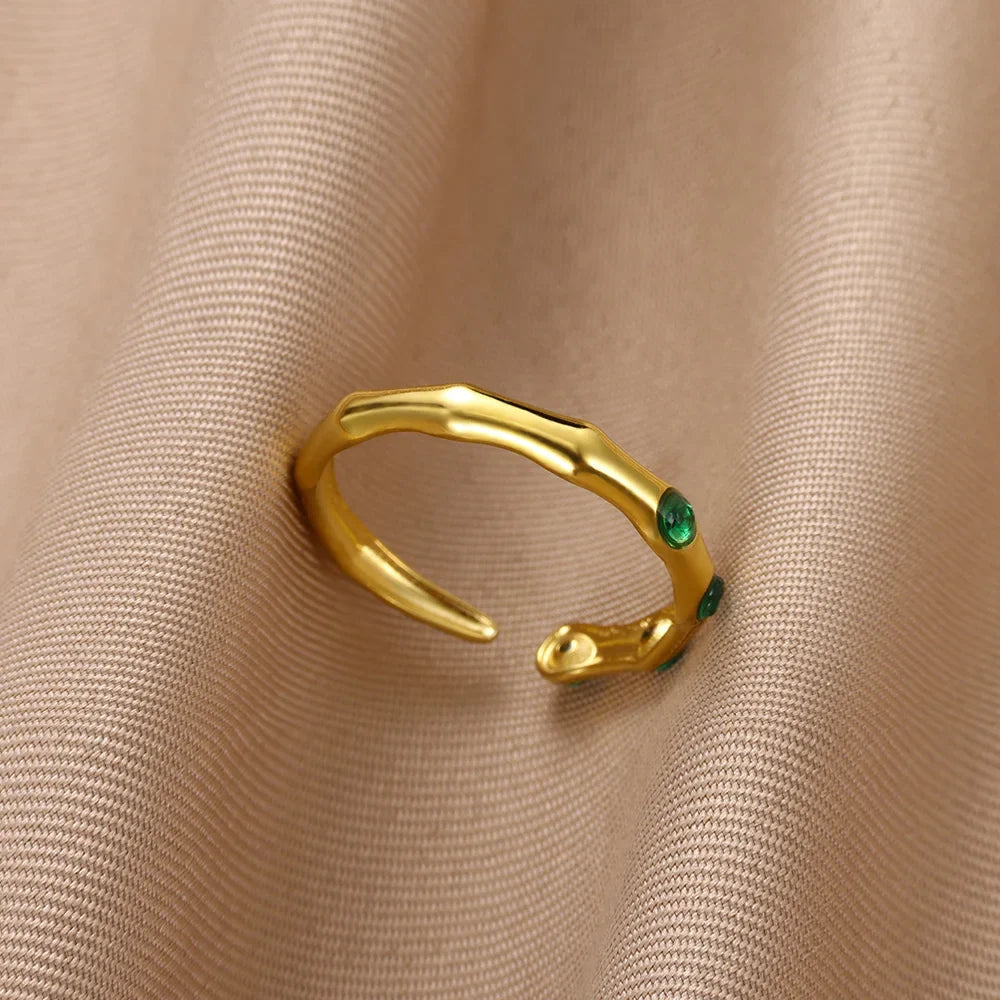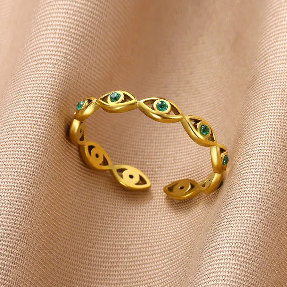 Anel de Aço Inoxidável com Zircão Verde e Olho Grego