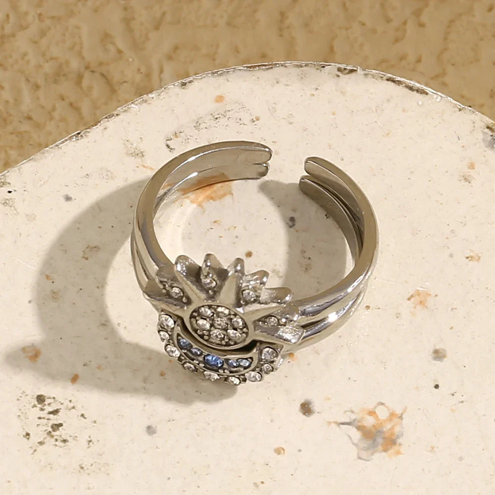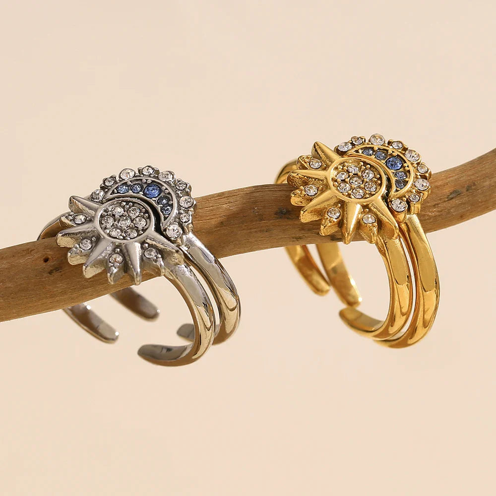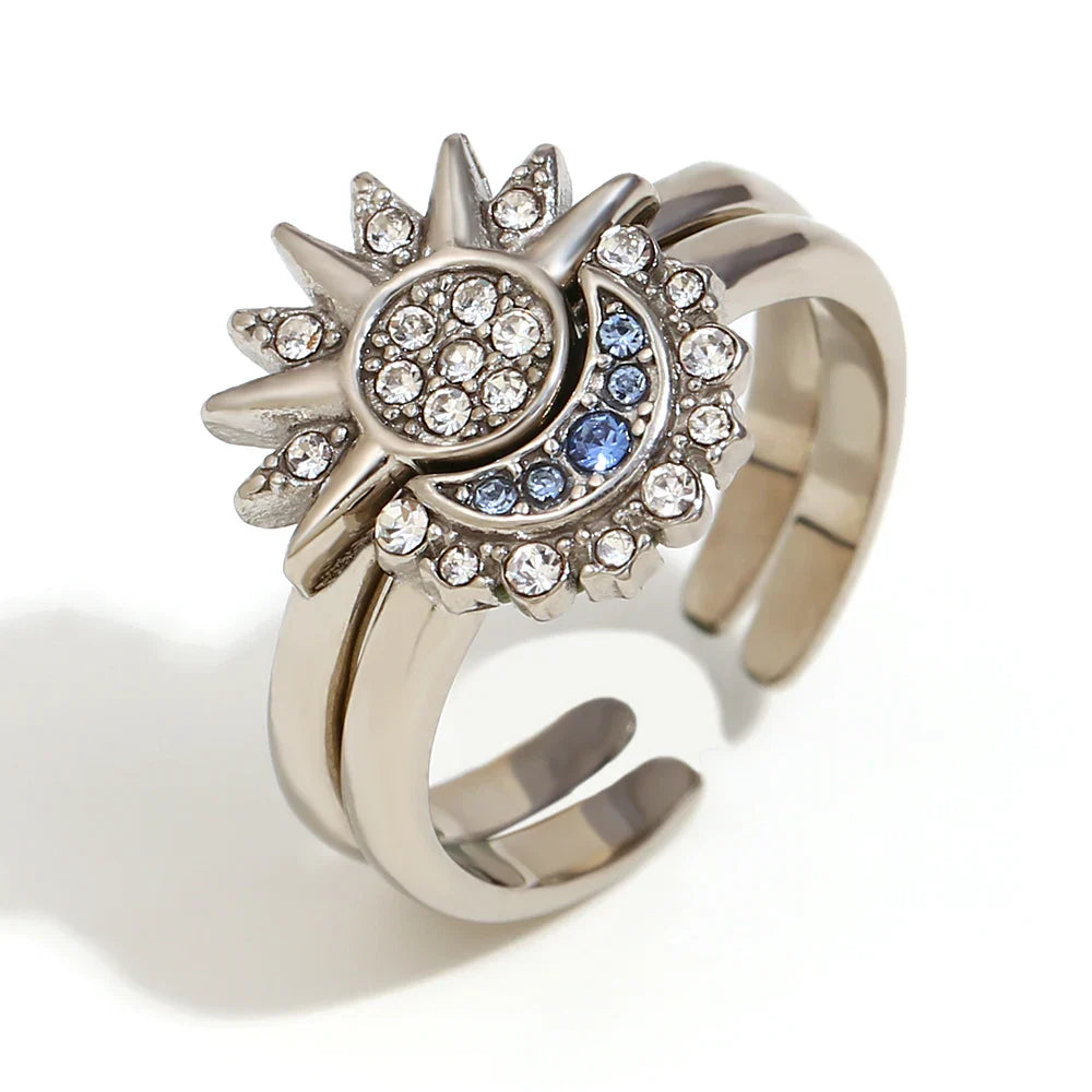 - Design Exclusivo: Inspirado nos elementos celestiais, o anel apresenta um deslumbrante design de sol e lua adornado com strass brilhantes.