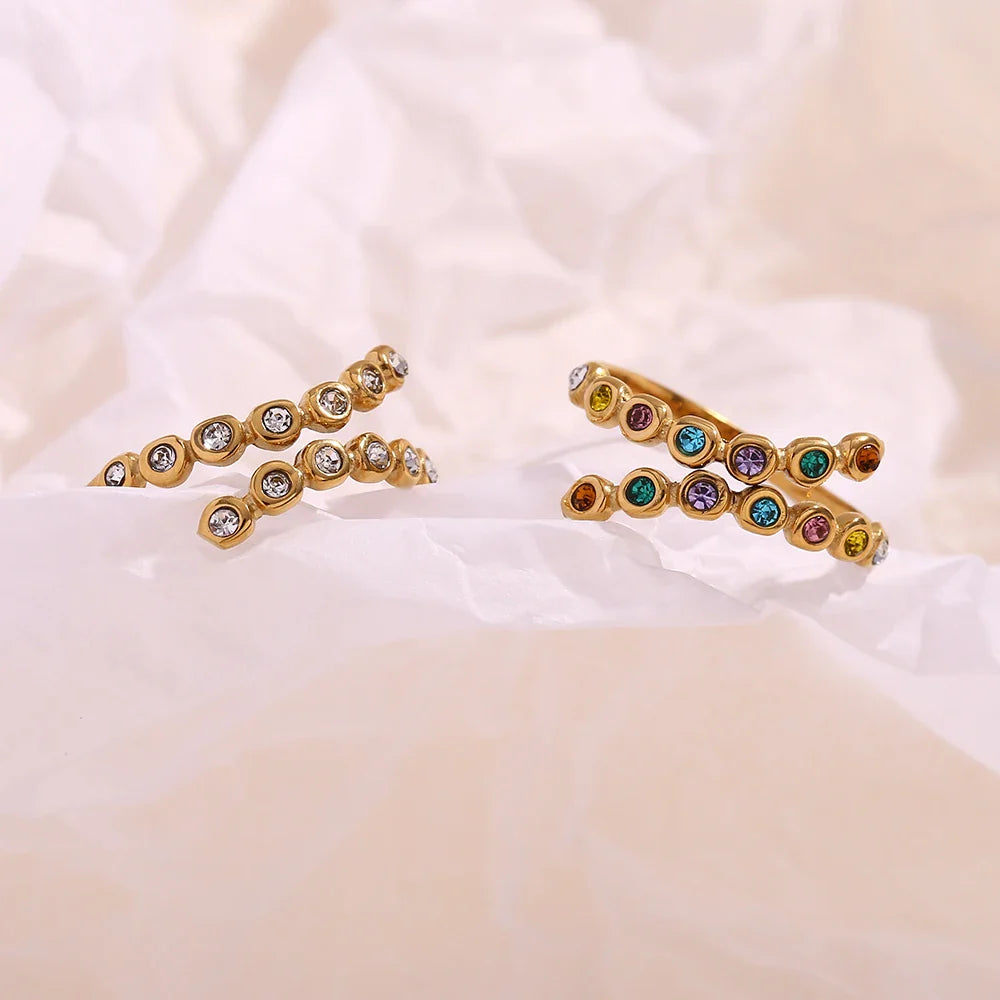 Descubra a sofisticação e o charme do Anel Elegance, uma peça que combina beleza e conforto. Com um design de abertura cruzada, este anel é adornado com deslumbrantes zircônias, proporcionando um brilho único e elegante.