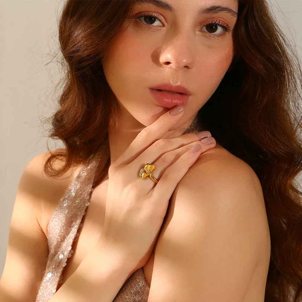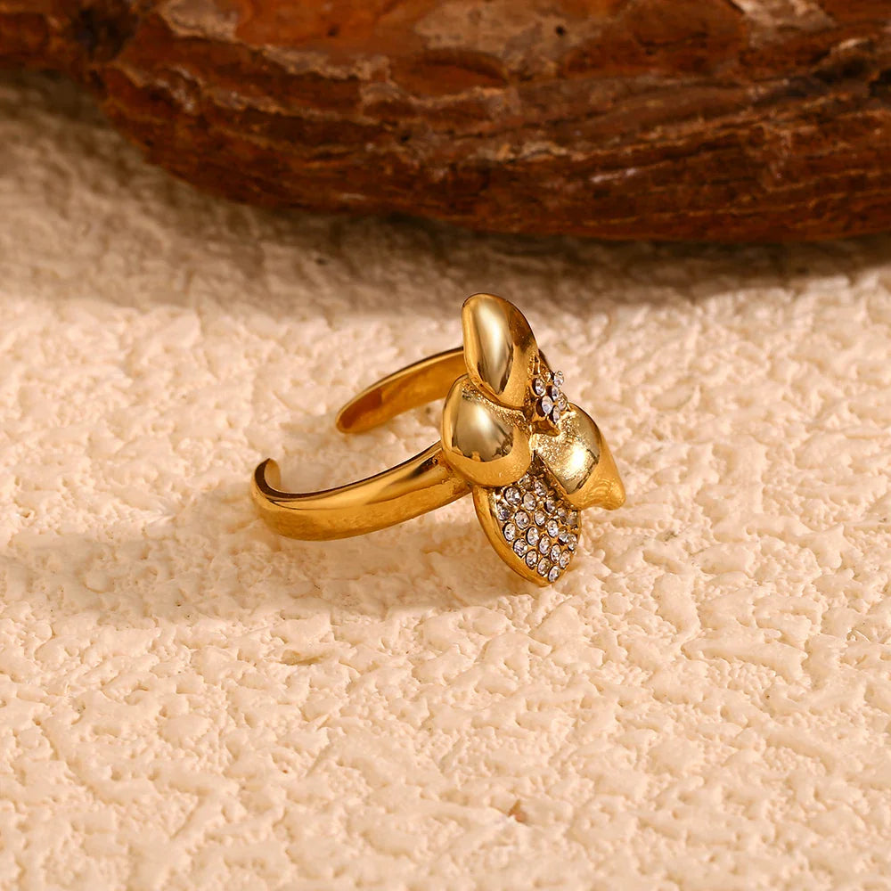 Anel Flor Assimétrico com Strass Banhado a Ouro