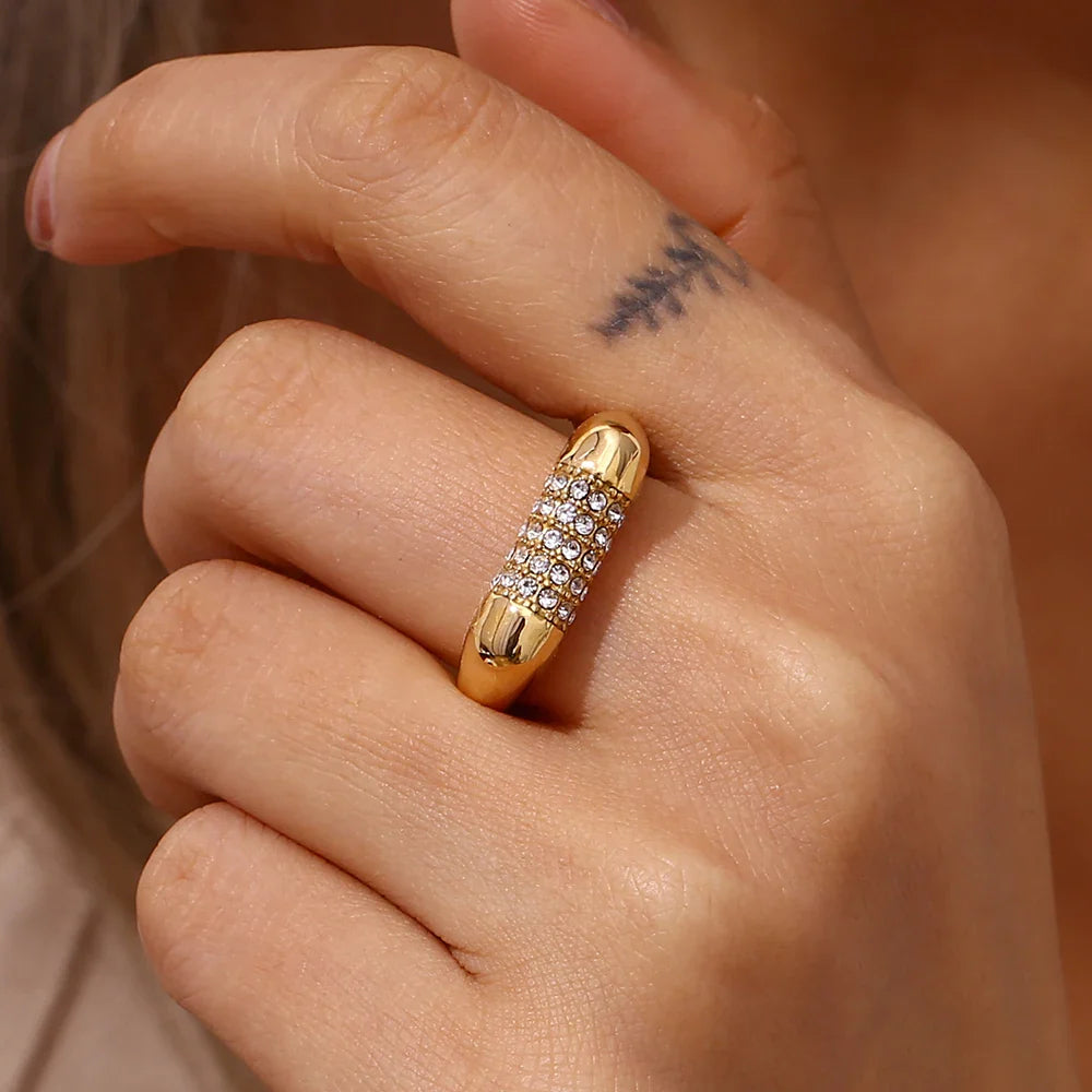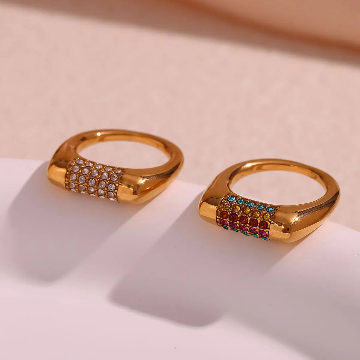 Anel Geométrico com Zircônias Coloridas Banhado a Ouro
