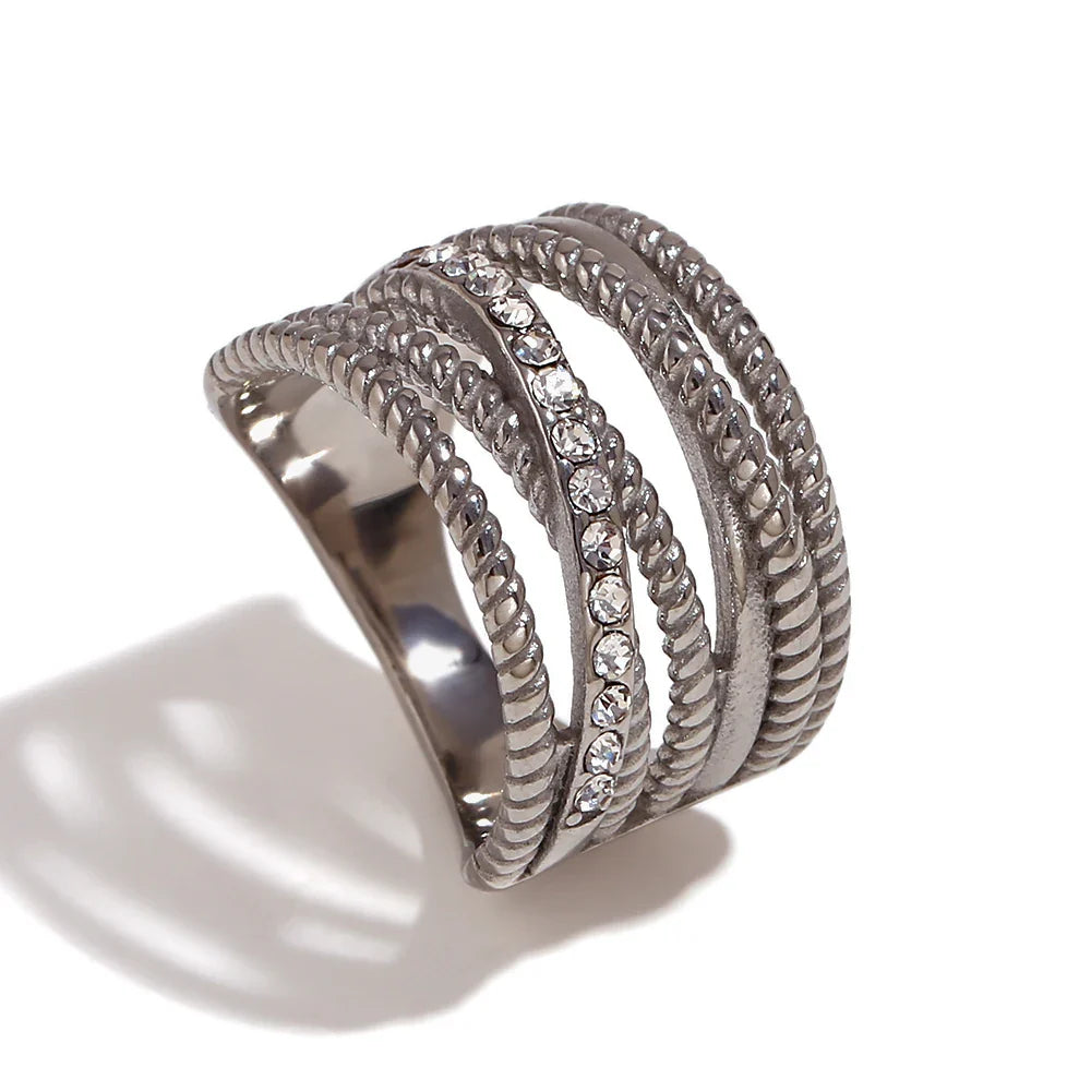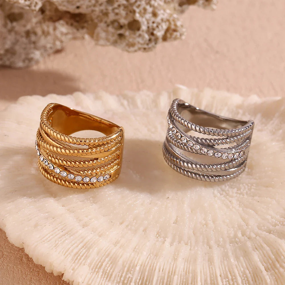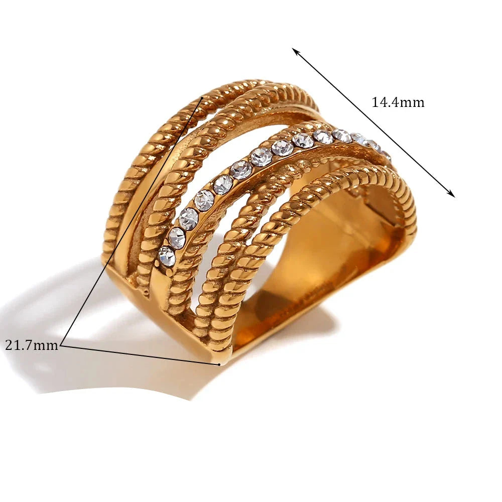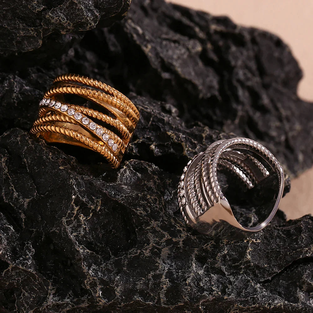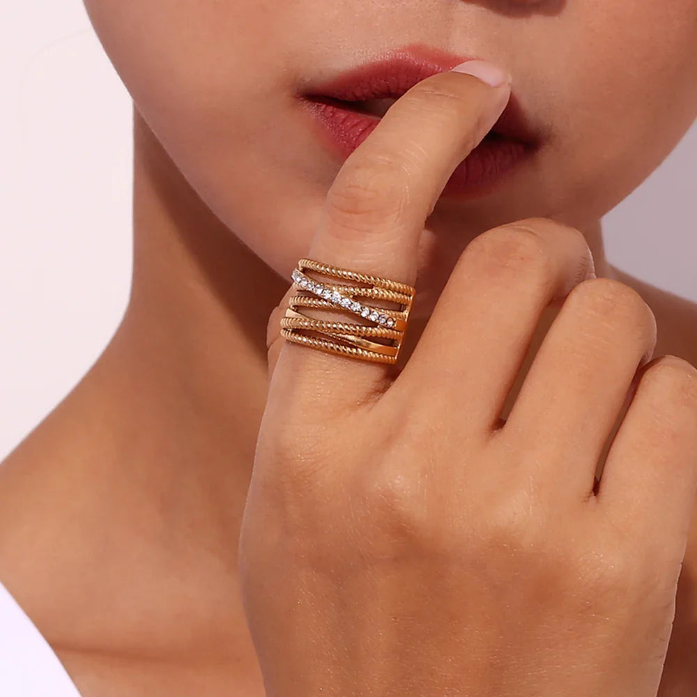 Anel Multicamadas com Torções e Zircônias para Mulheres