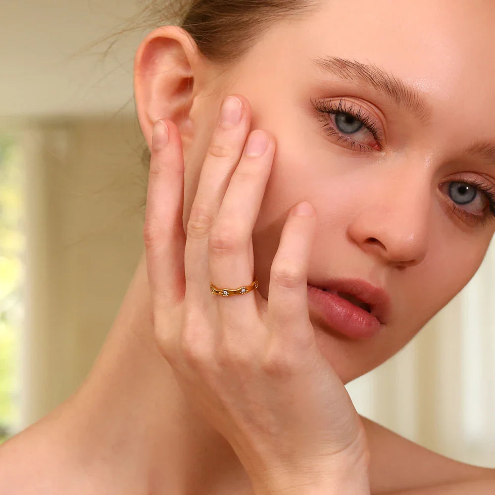 Transforme qualquer look com o Anel Onda Dourada com Zircônias e sinta-se especial em qualquer ocasião.