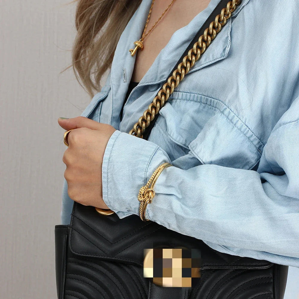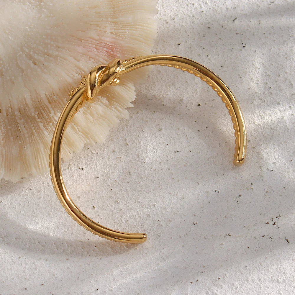 Verleihen Sie Ihrem Look einen Hauch von Eleganz und Raffinesse mit unserem geflochtenen Knoten-Armreif in 18K Gold. Dieses atemberaubende Accessoire ist perfekt für Frauen, die Stil und Qualität schätzen.