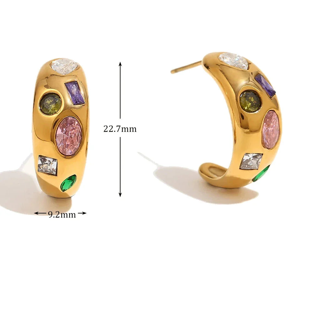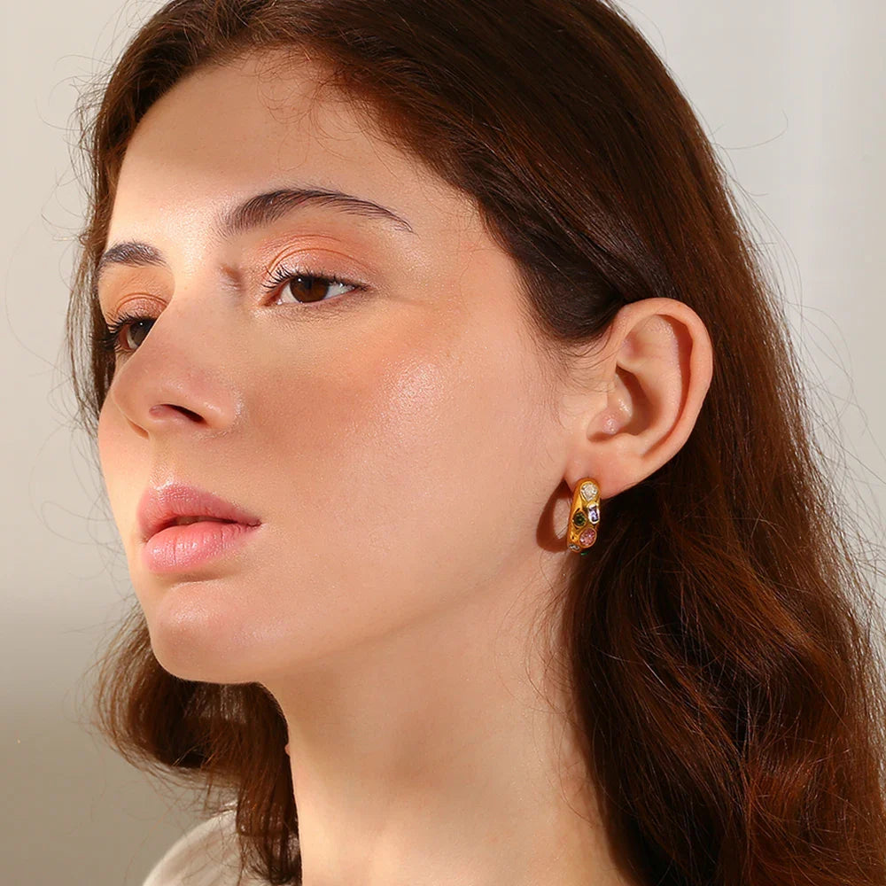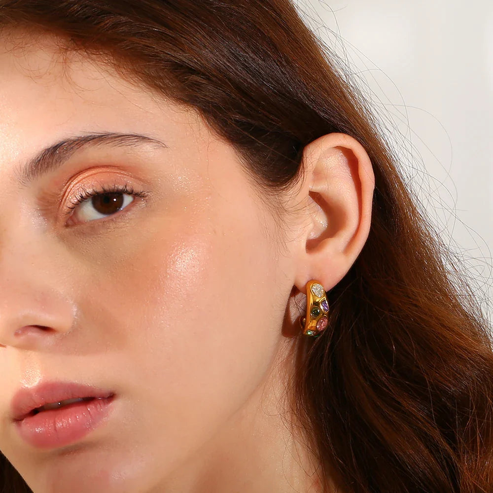 Verwandeln Sie Ihren Look mit den geometrischen bunten Zirkon-Ohrringen von Megan Joias und fühlen Sie sich bei jedem Event selbstbewusst und strahlend.