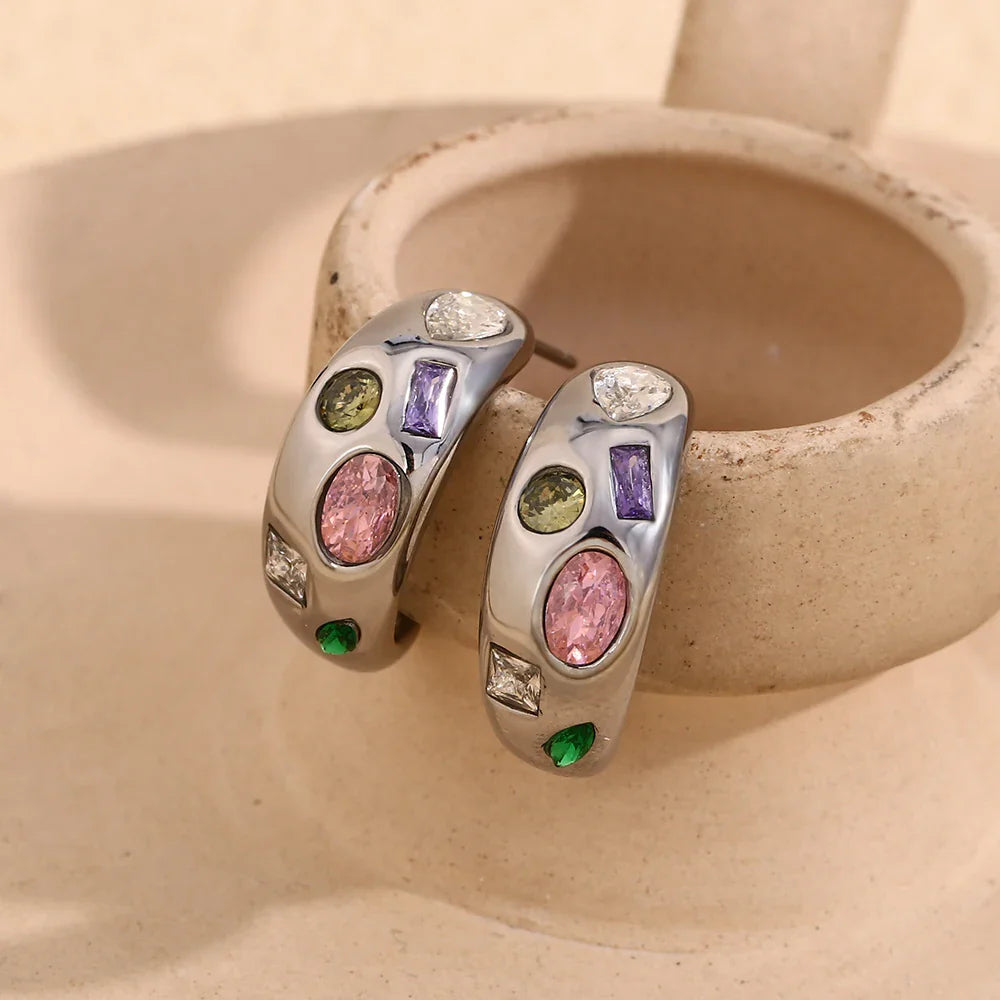 Exklusives Design: Die geometrische Form und die bunten Zirkonsteine schaffen einen modernen und eleganten Look.