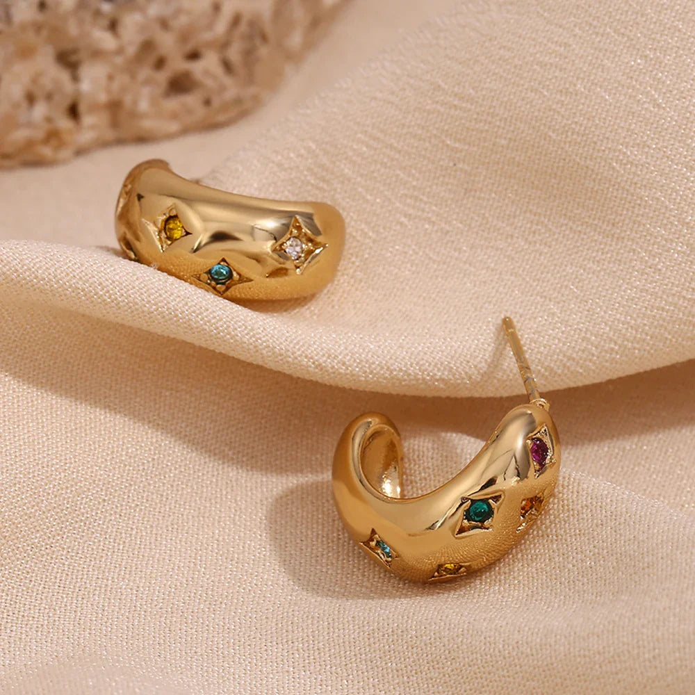 Adicione um toque de sofisticação ao seu visual com nossos Brincos de Argola com Estrelas e Zircônias Coloridas. Perfeitos para mulheres que buscam elegância e estilo, esses brincos são banhados a ouro 18K e feitos de aço inoxidável 316L, garantindo durabilidade e beleza.