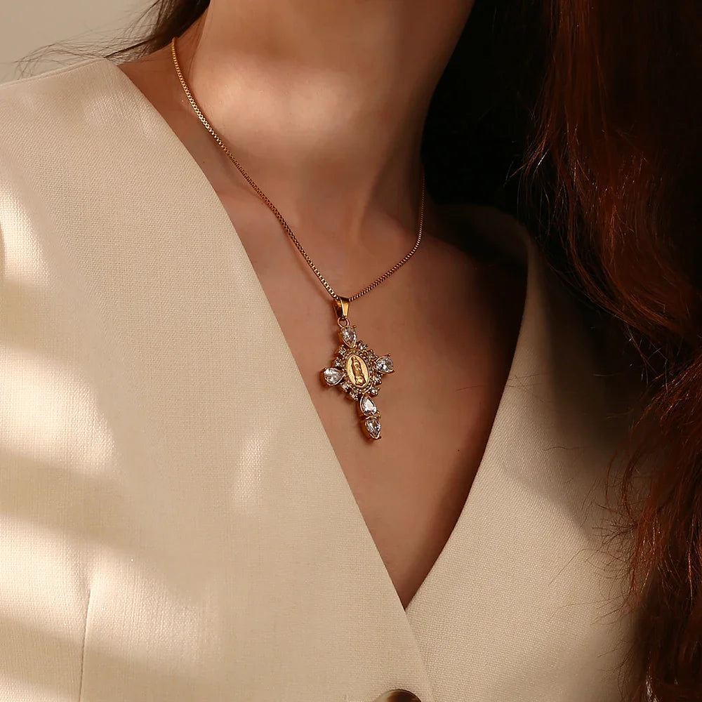 Adicione um toque de fé e estilo ao seu visual com o Colar Cruz Virgem Maria com Zircônia. Uma peça que transcende tendências e se torna um clássico em sua coleção de joias.