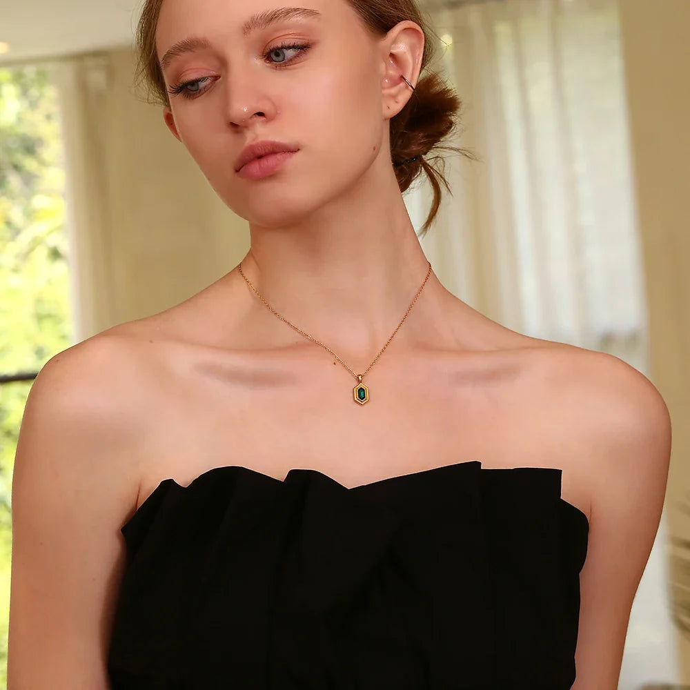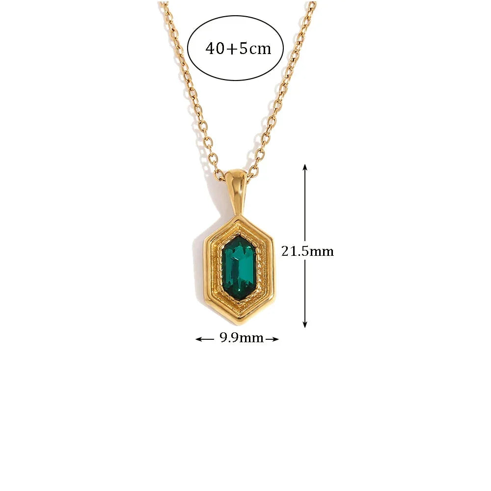 Verleihen Sie Ihrem Look mit unserer Hexagonalen grünen Halskette mit Strass einen Hauch von Eleganz und Raffinesse. Diese Halskette ist die perfekte Wahl für alle, die ein Accessoire suchen, das Charme und Haltbarkeit vereint.