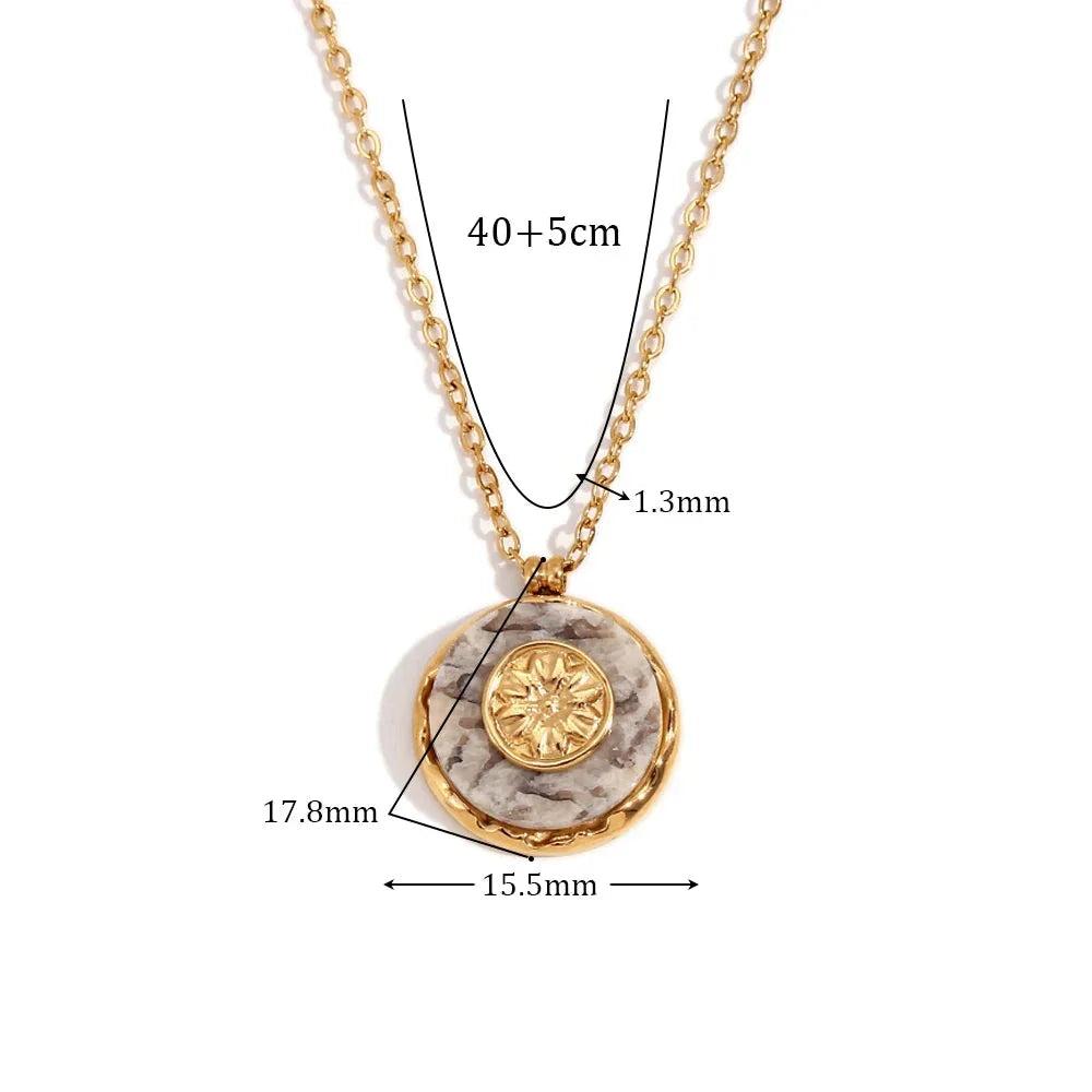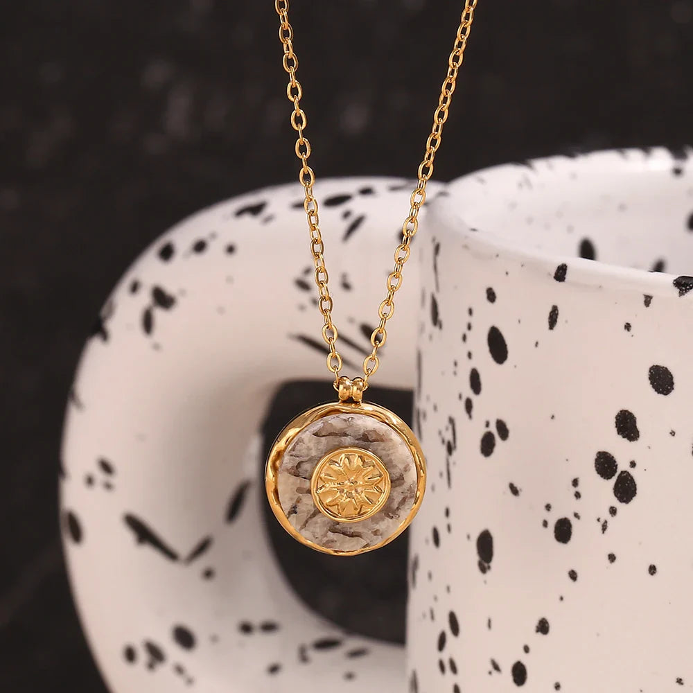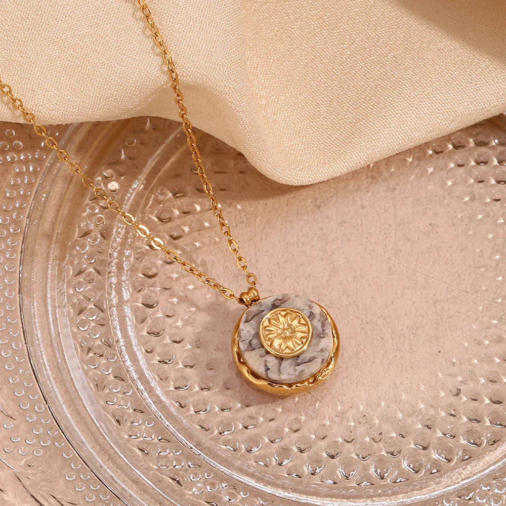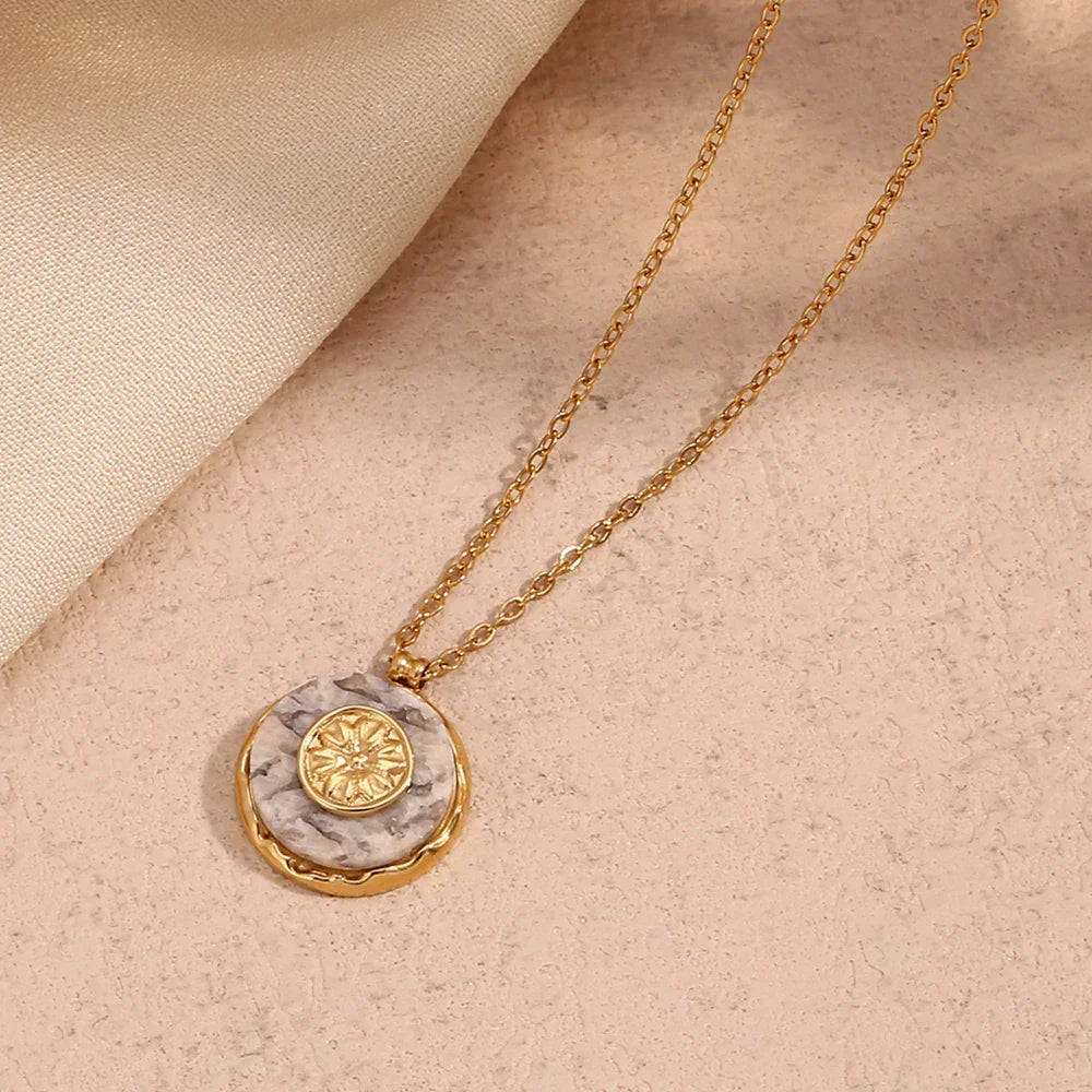 Ideal para qualquer ocasião, este colar é a escolha perfeita para quem busca estilo e elegância. Transforme seu visual com o Colar Pingente Mármore Natural com Sol Dourado e sinta-se especial todos os dias.