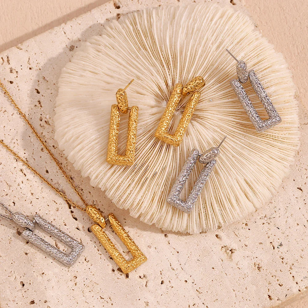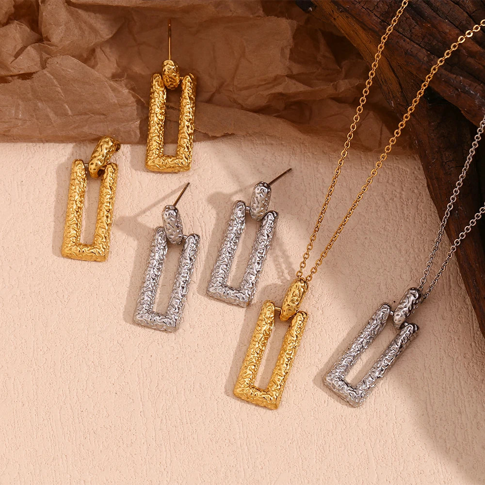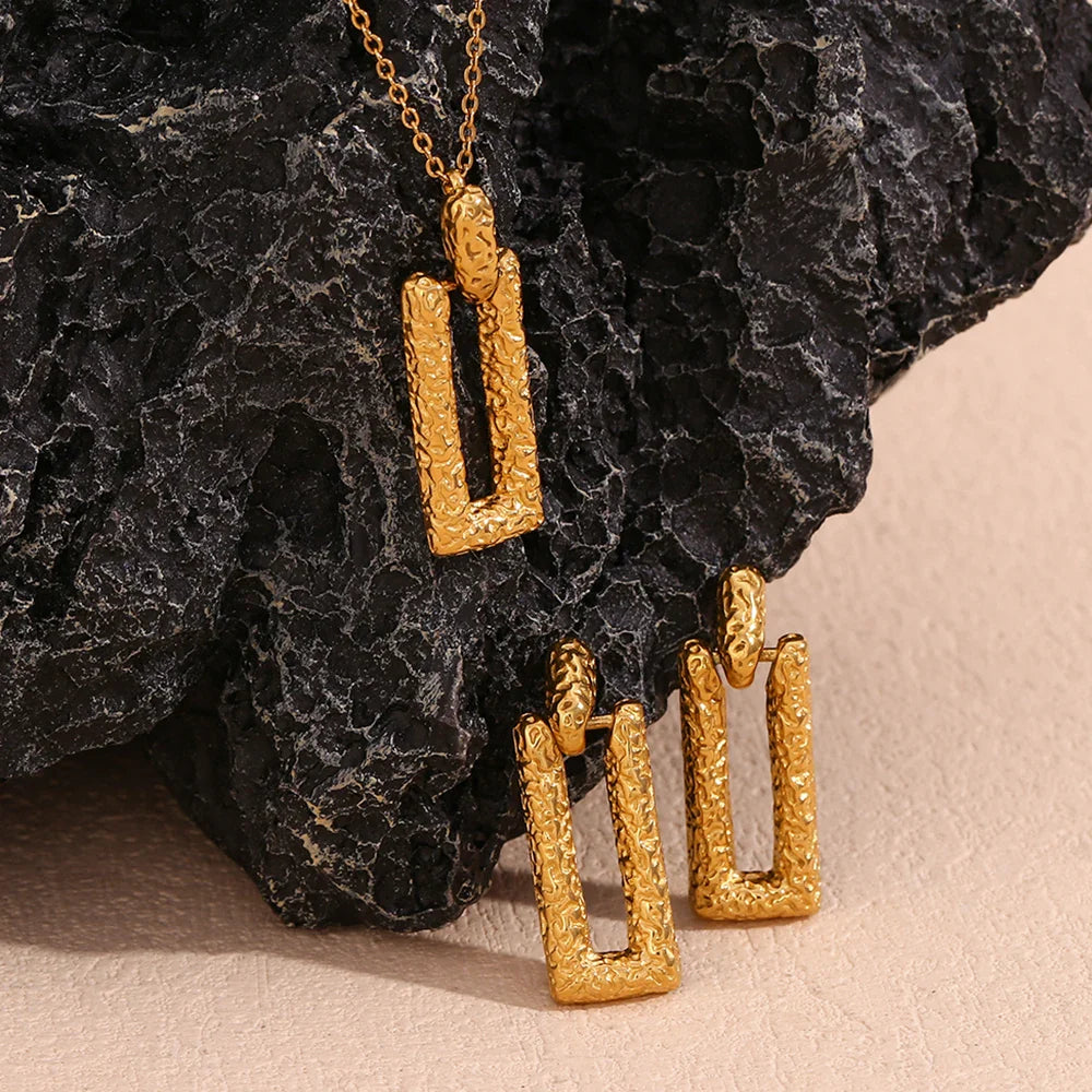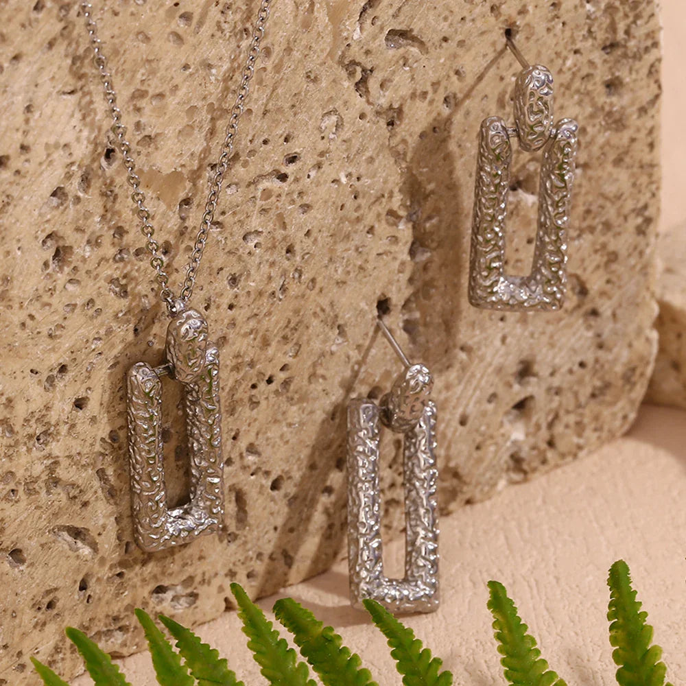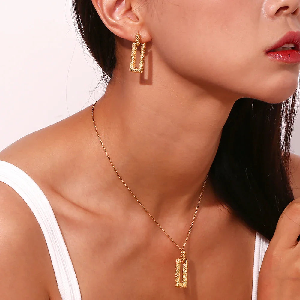 Colar e Brinco Retangular Longo com Padrão de Martelo