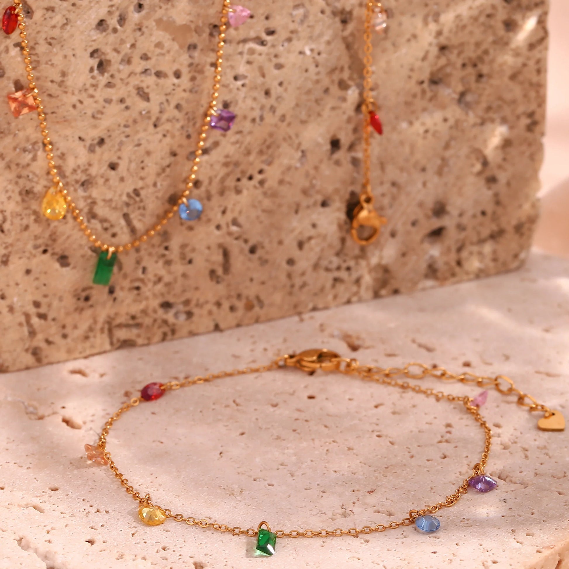 Entdecken Sie die Eleganz und den unwiderstehlichen Charme des Sets Schmuck Megan Schmuck, einer Kollektion, die Raffinesse und Modernität vereint. Dieses Set umfasst eine Halskette, ein Armband und ein Fußkettchen, alle verziert mit farbigen Zirkonia-Steinen, die bei jeder Bewegung funkeln.