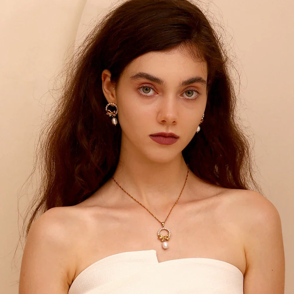 Set Schmuck Perle und Schleife mit Goldüberzug