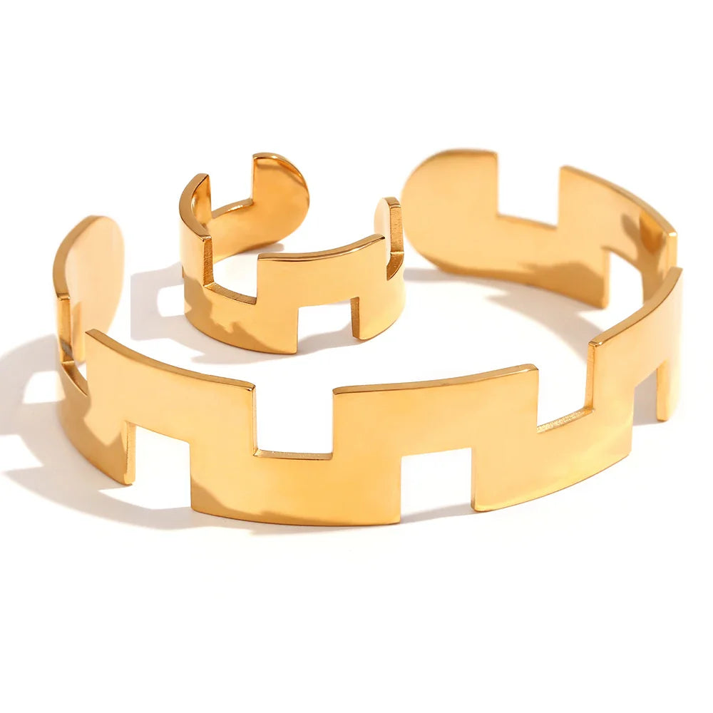 Transforme seu visual com o nosso elegante Conjunto de Jóias Ajustável Puzzle, banhado a ouro 18K. Este conjunto inclui uma pulseira e um anel, ambos projetados para adicionar um toque sofisticado e moderno ao seu estilo.