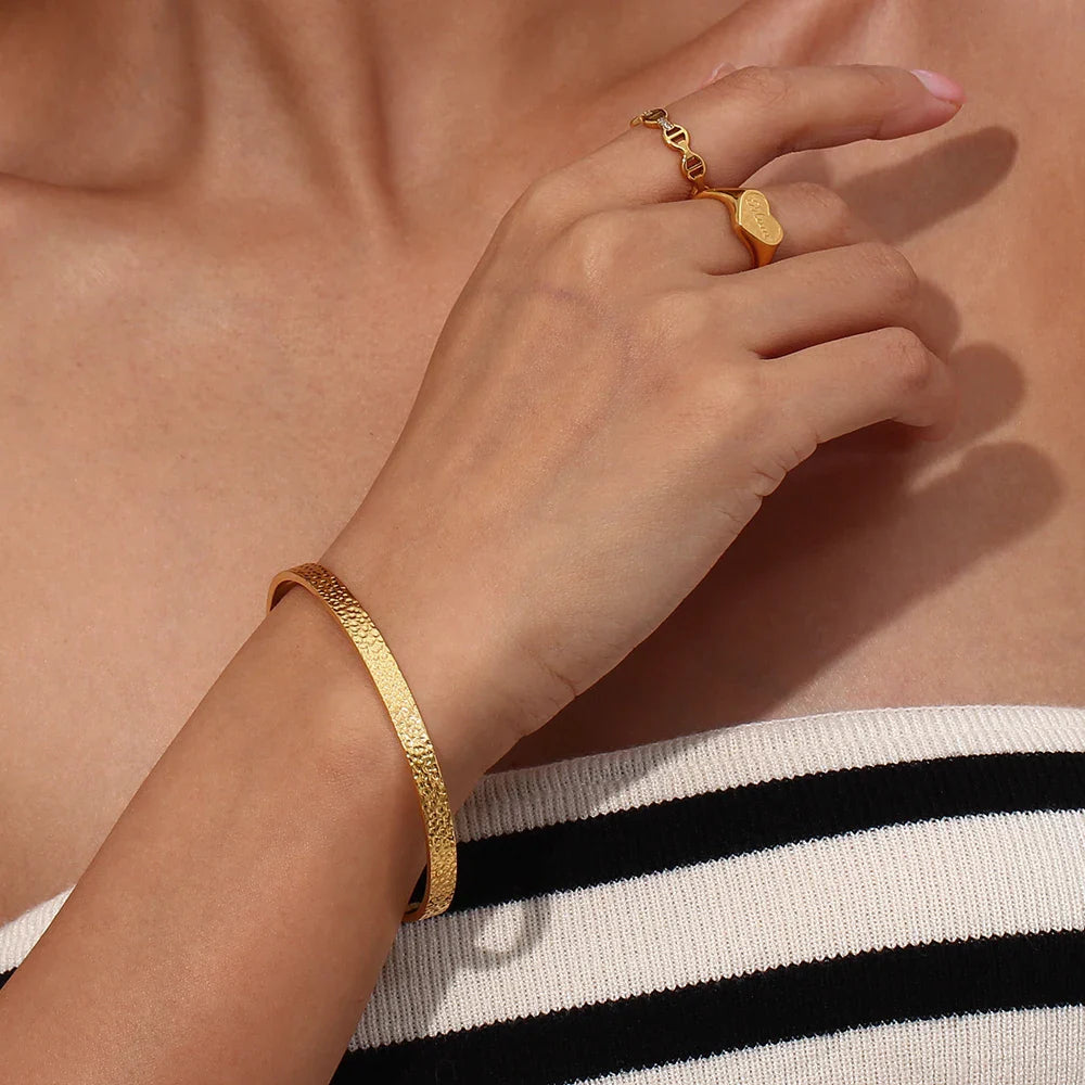 Verleihen Sie Ihrem Look einen Hauch von Raffinesse mit unserem eleganten Armband aus Edelstahl. Mit einem Design, das eine gehämmerte Körnungstextur aufweist, ist dieses Schmuckstück perfekt für Frauen, die Stil und Qualität schätzen.